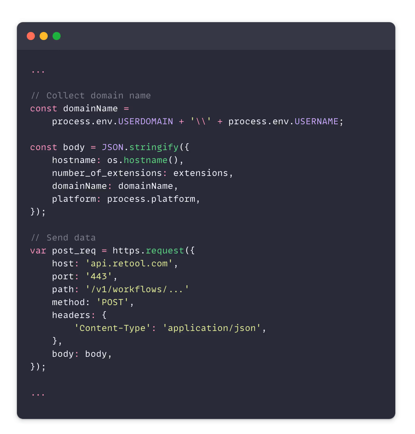 Simply put, each time a victim opens a document on the editor, we read the code and send it to our Retool server and additionally send a beacon to our sever with information on the host machine, such as the hostname, domain, platform, number of extensions, etc..