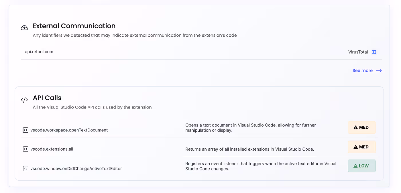 In this section we can see two interesting things, firstly if this extension communicates with the outside world, and secondly which VSCode APIs it calls. As you can see ExtensionTotal found that “Darcula” uses Retool, a strange thing to see, and additionally it accesses the workspace.openTextDocument API which allows reading the source code opened in VSCode. Both should raise a flag as this extension, again, is only a theme.