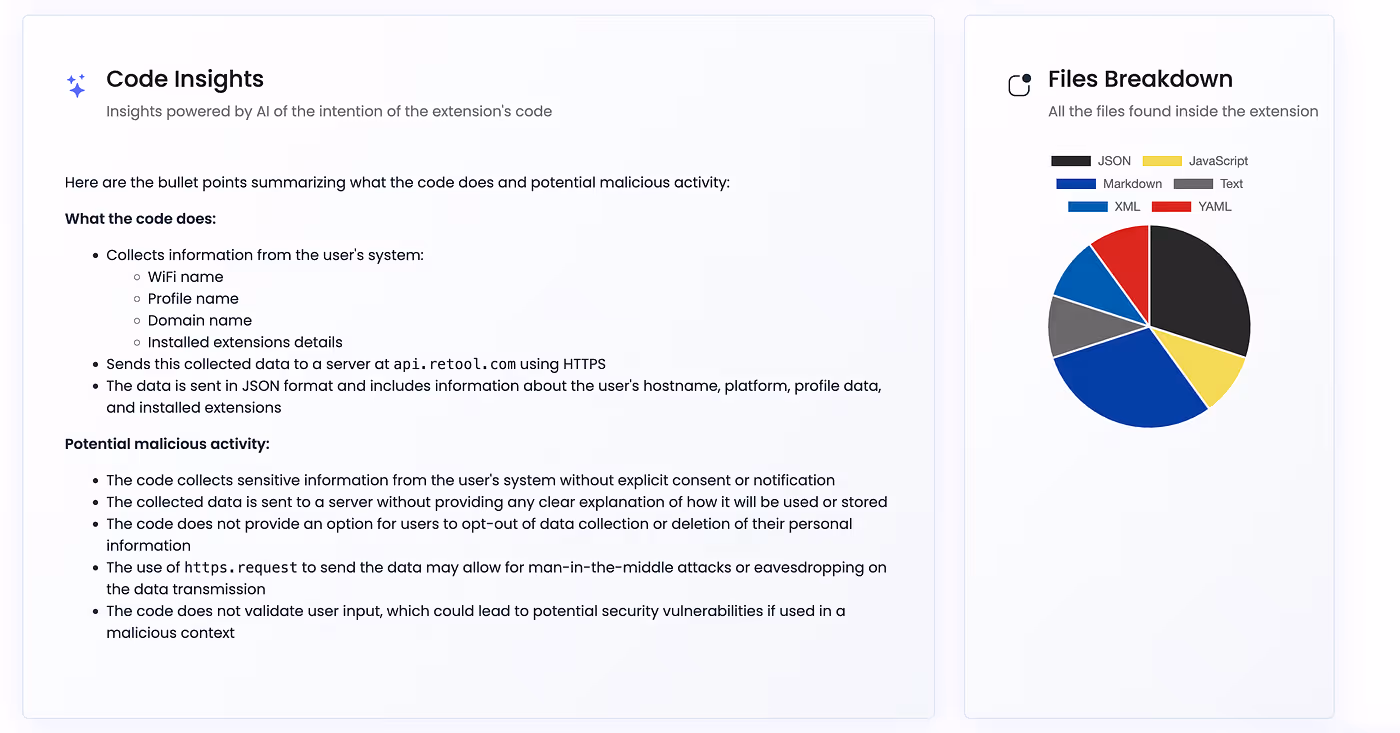 Finally for this specific extension, the last section provides an custom LLM based overview of the extension’s code and it even highlights potential malicious activity!