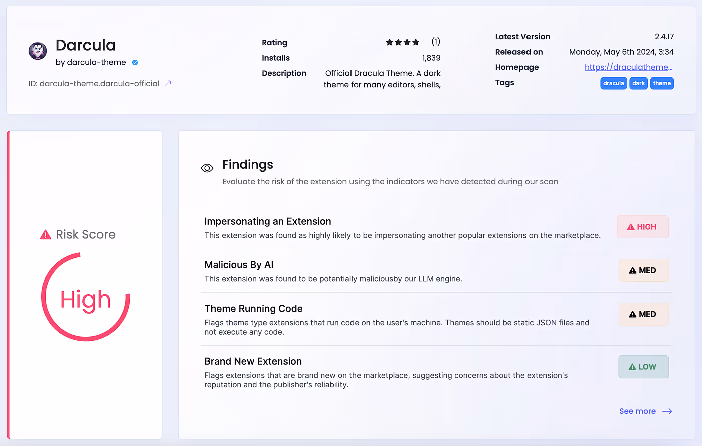 You can search any extension that is or was live on the VSCode Marketplace and get a comprehensive report including a factored risk score, findings, and breakdown on the risks associated with the extension.