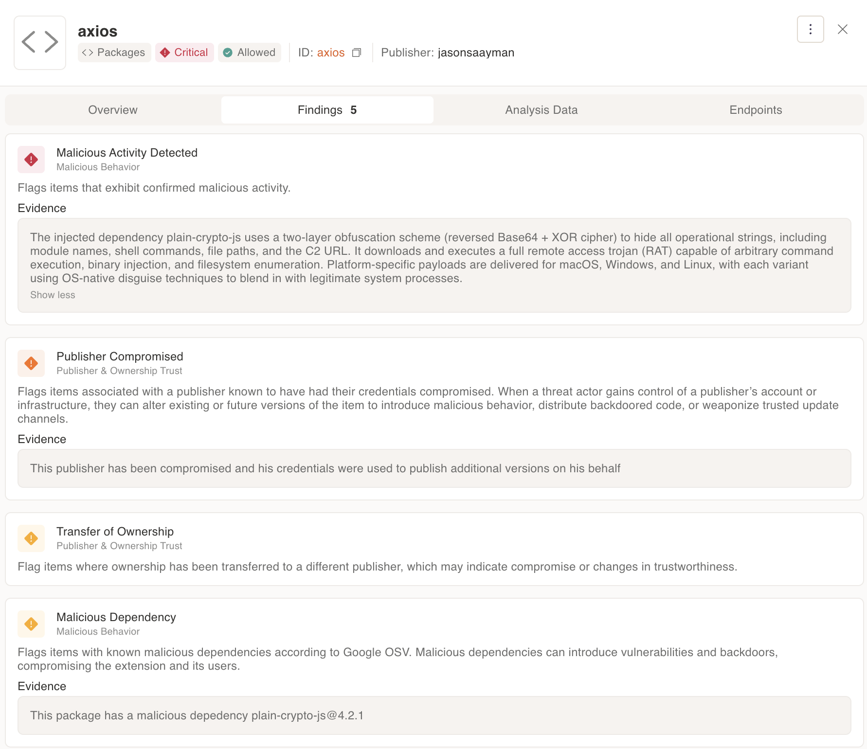 Security teams across the ecosystem responded quickly to this incident. Socket's automated scanner flagged plain-crypto-js and StepSecurity performed full static and runtime analysis of the dropper. Their published research provided valuable technical context as the community worked to understand the full scope of the compromise.