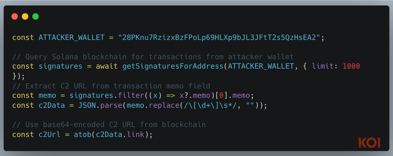 - Dynamic and cheap: Want to update your payload? Just post a new transaction. Cost? 0.000005 SOL - less than a penny. The attacker can rotate infrastructure as often as they want for pocket change.