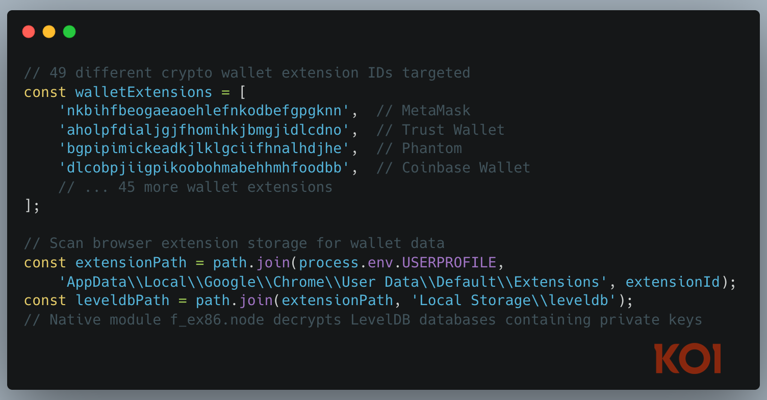 - 49 different cryptocurrency wallet extensions - targeting MetaMask, Phantom, Coinbase Wallet, and dozens more