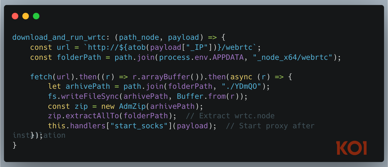 - Deploys SOCKS proxy servers, turning developer machines into criminal infrastructure