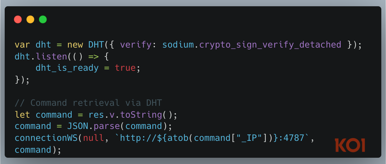Commands are distributed through the BitTorrent DHT network - the same decentralized system that makes torrent tracking impossible to shut down. There's no central C2 server to take offline. Commands propagate through a distributed network of millions of nodes.