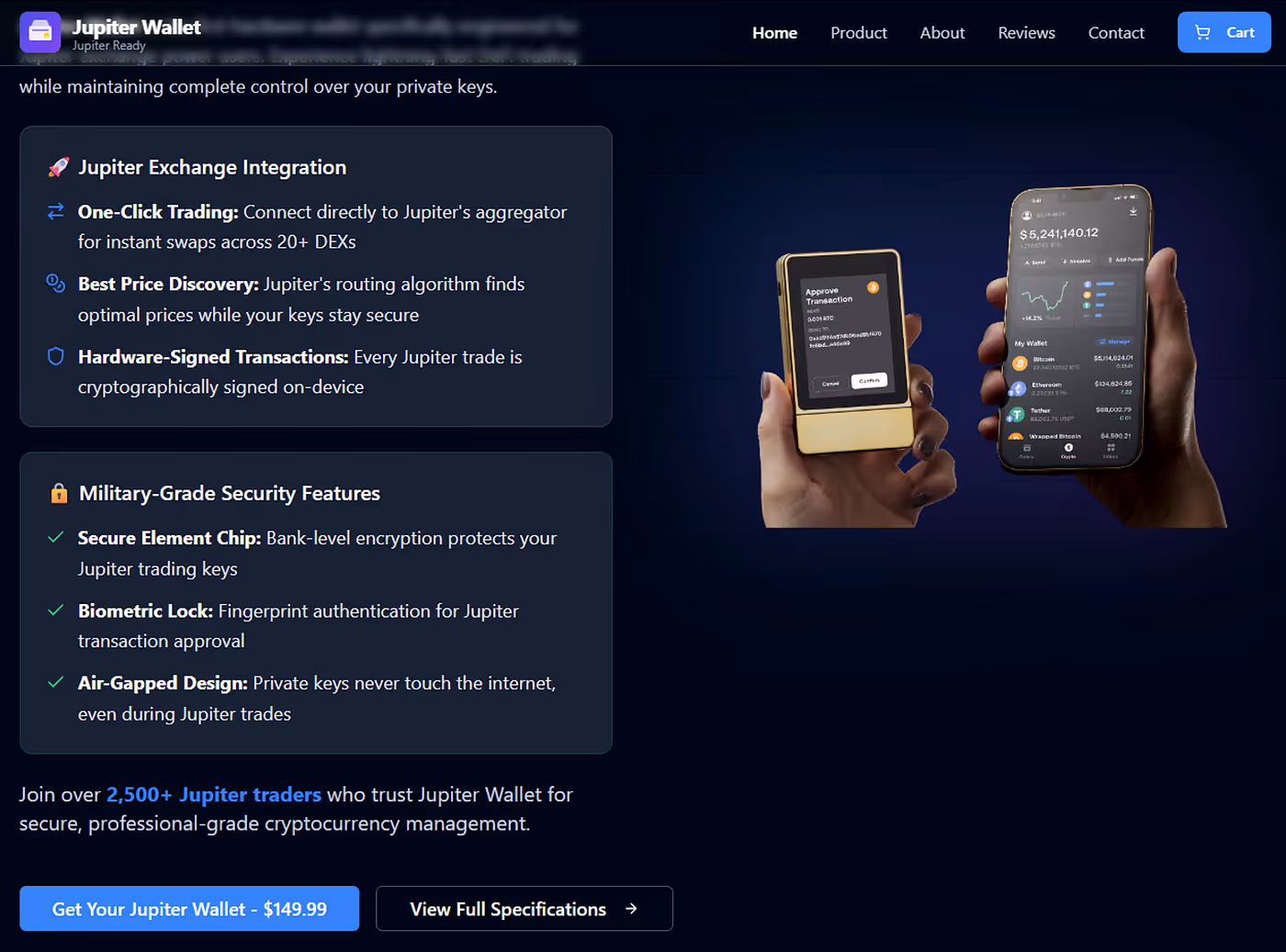 - Jupiter-branded hardware wallets with fabricated UI mockups