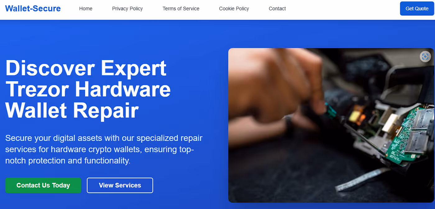 Alongside malware and extensions, the threat group has also launched a network of scam websites posing as crypto-related products and services. These aren’t typical phishing pages mimicking login portals — instead, they appear as slick, fake product landing pages advertising digital wallets, hardware devices, or wallet repair services.