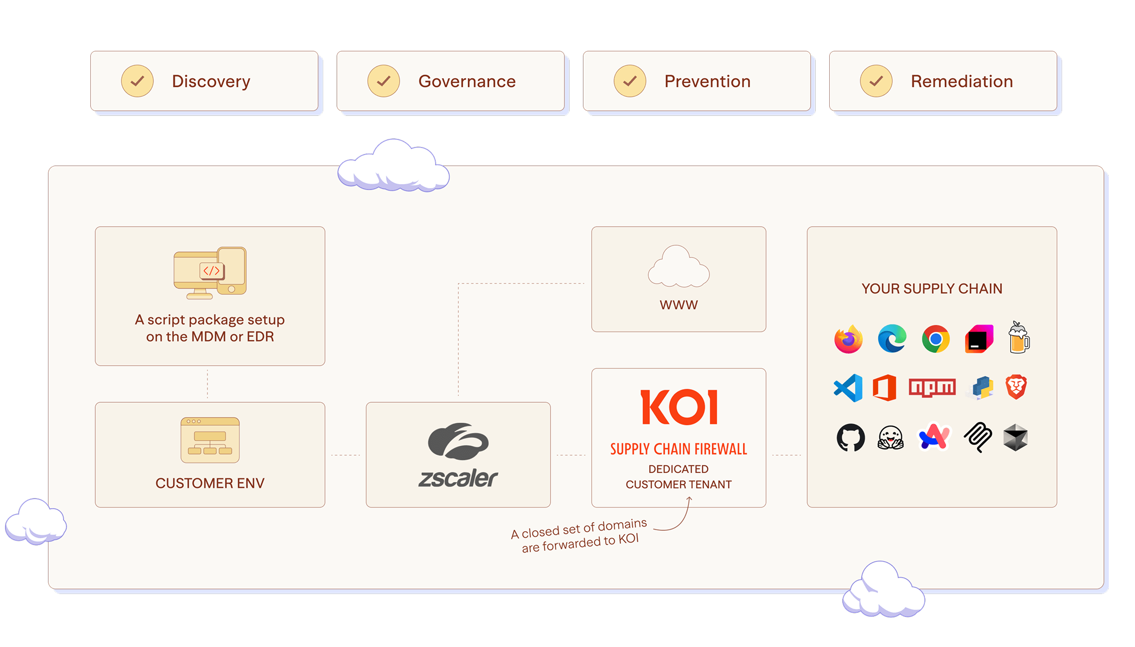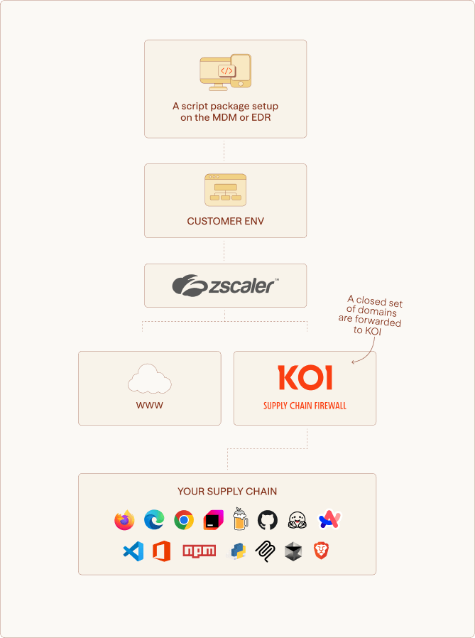 Koi’s Supply Chain Gateway (SCG) is a new architectural layer that acts as a proactive network-based gate for curating incoming software from marketplaces, app stores, or registries like Github, Hugging Face, Chrome Web Store, Visual Studio Code Marketplace, and Homebrew.