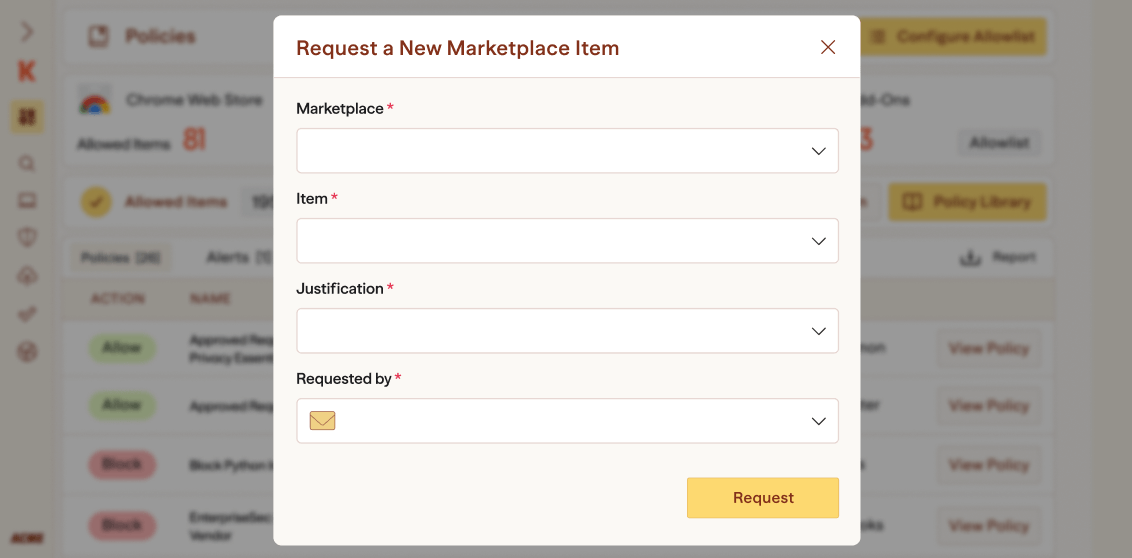 Instead of blocking the marketplace, app store, or registry in its entirety, use Koi to empower your enterprise teams to adopt software, while adhering to organizational policies.